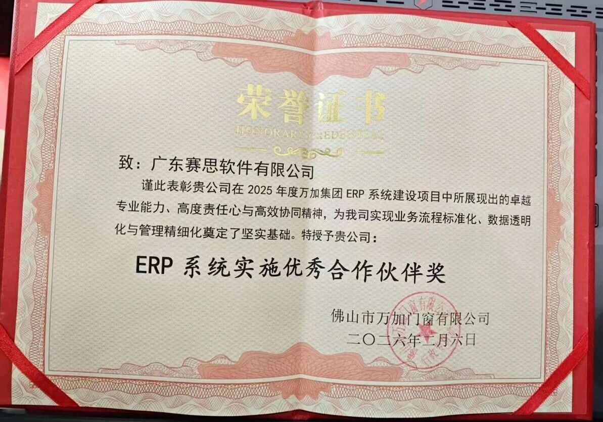 门窗行业头部企业的权威认证,是赛思软件深耕家居数智化领域最坚实的底气。佛山市万加门窗有限公司作为行业内极具影响力的大型智能门窗企业,近日向广东赛思软件有限公司颁发荣誉奖项,以表彰赛思软件在双方数智化合作项目中的卓越表现与核心价值。这份来自行业标杆的认可,不仅是对赛思专业实力的高度肯定,更印证了赛思家居ERP系统在大型门窗企业数字化转型中的硬核赋能能力。