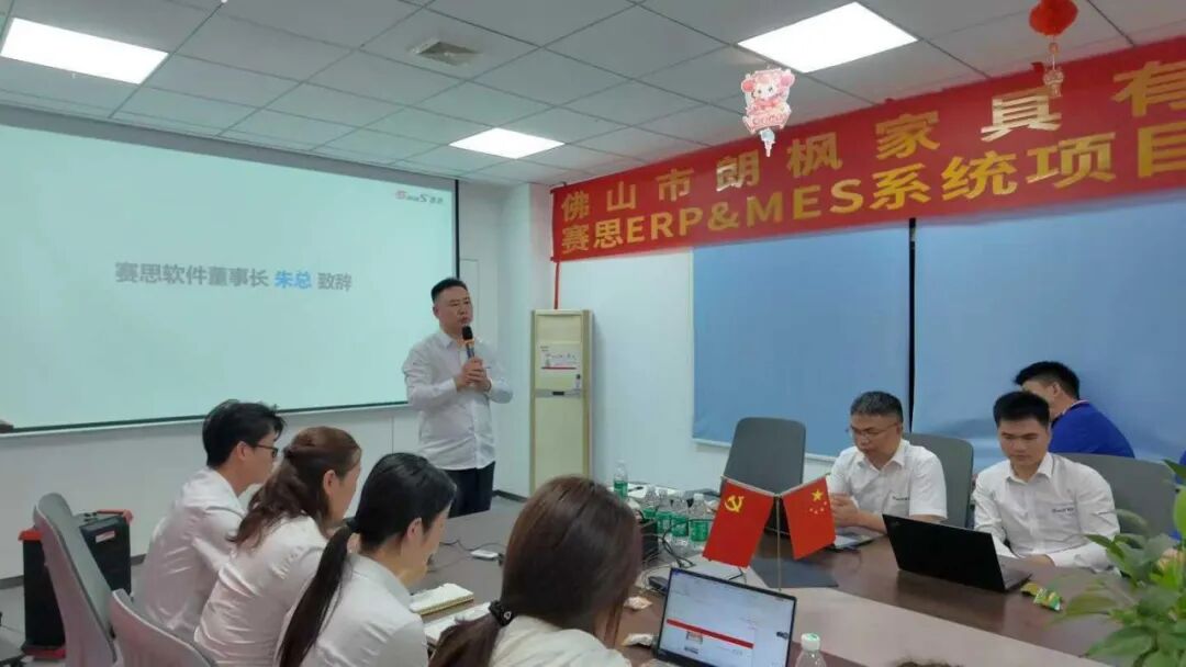 赛思软件董事长朱总随后发表讲话,他对朗枫家具的信任与支持表示感谢,并详细介绍了赛思软件在家具行业数字化领域的丰富经验与技术优势。朱总表示,赛思软件将组建专属项目团队,结合朗枫家具的业务特点与发展需求,提供定制化的ERP&MES解决方案,助力企业构建高效协同的数字化管理体系。他承诺,赛思软件将全程保障项目实施质量,通过专业的技术服务与培训支持,帮助朗枫家具快速掌握系统应用,真正实现“降本、提质、增效”的核心目标。